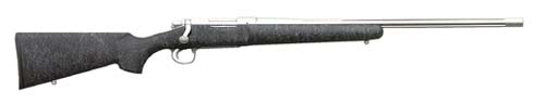 The Model 700P features a composite stock reinforced with Du Pont Kevlar and fiberglass. It'll stay dimensionally stable in any weather and under the worst tactical situations. The stock is laid up around an aircraft-grade aluminum bedding block that runs up the entire length of the receiver. It has a textured, black, non-reflective finish and comes with sling swivel studs.